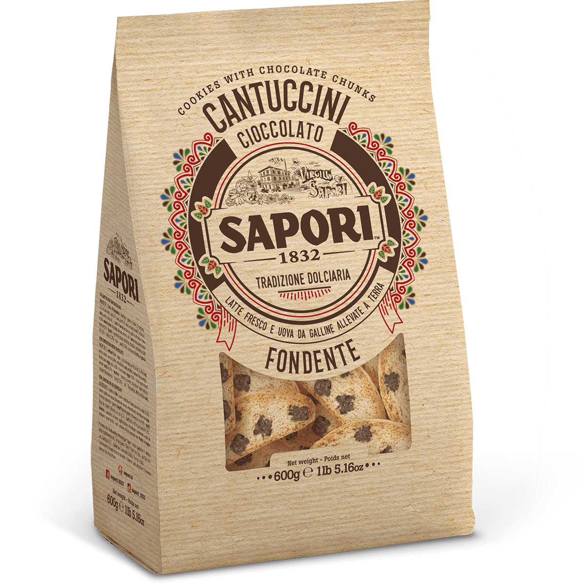 I Cantuccini Sapori al cioccolato si ispirano alla ricetta della tradizione toscana ma ne danno una nuova interpretazione, ancora più golosa. Gustosi pezzi di cioccolato fondente si uniscono a latte fresco, uova fresche da galline allevate a terra e miele creando un delizioso contrasto tra la croccantezza del biscotto e la golosità del cioccolato.